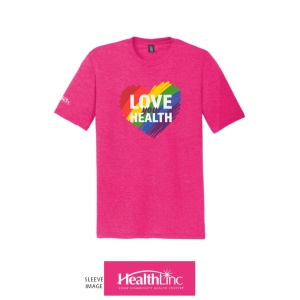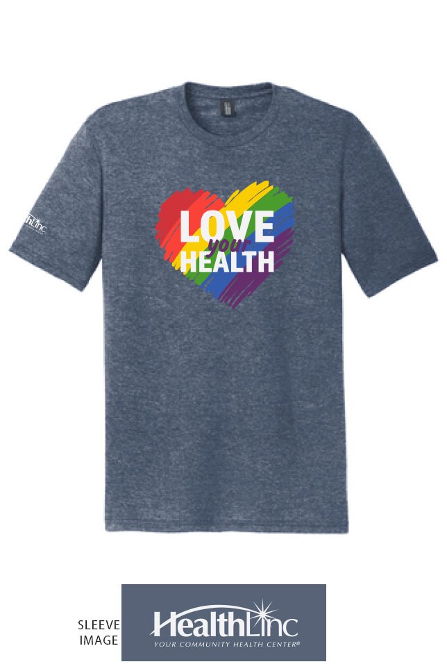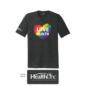 This shirt is constructed of 4.5-ounce, 50/25/25 poly/ring spun combed cotton/rayon, 32 singles and features a 1x1 rib knit neck.  Available in maritime frost blue, fuchsia and black frost.  Sizes available are xsmall through 4XL.  The shirt features the Love your Health logo on the front and the HealthLinc logo on the sleeve.